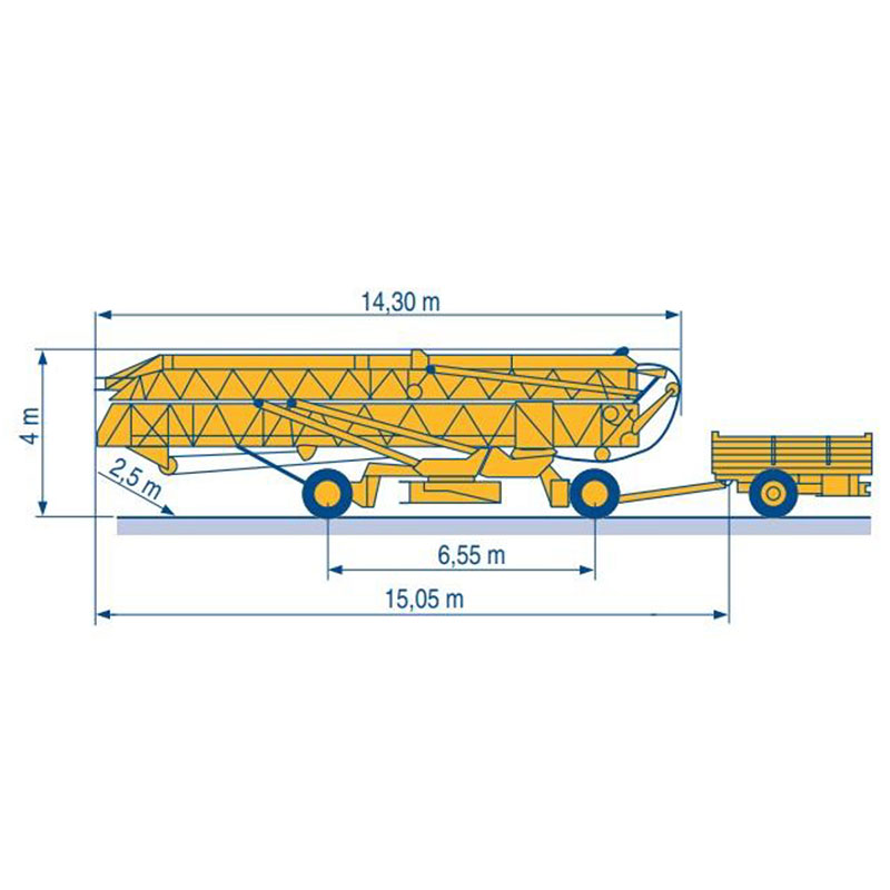 • ความกว้างฐาน 4.5 ม. พับแล้วยาว 14.5 ม. ความสูงบนล้อ 4 ม.